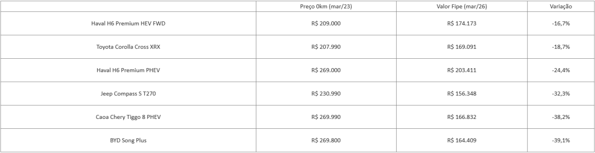 No estudo, que utiliza como base a tabela Fipe – referência na pesquisa de preços do mercado automotivo –, o Toyota Corolla Cross XRX Hybrid teve desvalorização de 18,7% em três anos, enquanto BYD Song Plus e Caoa Chery Tiggo 8 registraram perdas próximas a 40%. Mesmo no caso do Jeep Compass S, um dos principais representantes no segmento de SUVs médios com motor a combustão, a desvalorização é maior que a do SUV da GWM: acima de 30% em três anos de uso.